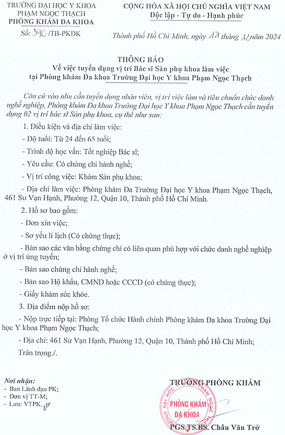 – Địa điểm: Phòng Tổ chức Hành chính Phòng khám Đa khoa Trường Đại học Y khoa Phạm Ngọc Thạch 461 Sự Vạn Hạnh, Phường 12, Quận 10, Thành phố Hồ Chí Minh
