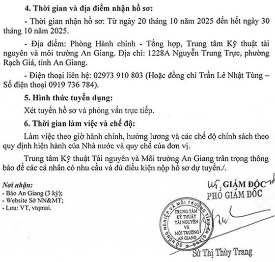 – Địa điểm: Phòng Hành chính – Tổng hợp, Trung tâm Kỹ thuật tài nguyên và môi trường An Giang. Địa chỉ: 1228A Nguyễn Trung Trực, phường Rạch Giá, tỉnh An Giang.