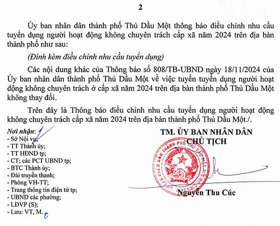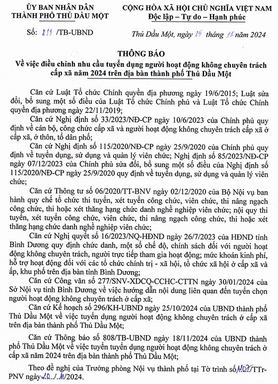 UBND thành phố Thủ Dầu Một, Bình Dương điều chỉnh nhu cầu tuyển dụng người HĐ không chuyên trách cấp xã năm 2024