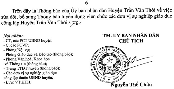 Thông báo sửa đổi, bổ sung Thông báo tuyển dụng viên chức các đơn vị sự nghiệp giáo dục công lập Huyện Trần Văn Thời, cụ thể như sau: