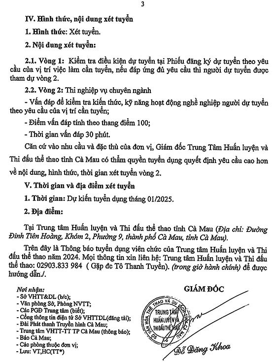Trung tâm Huấn luyện và Thi đấu thể thao tỉnh Cà Mau tuyển dụng viên chức năm 2024