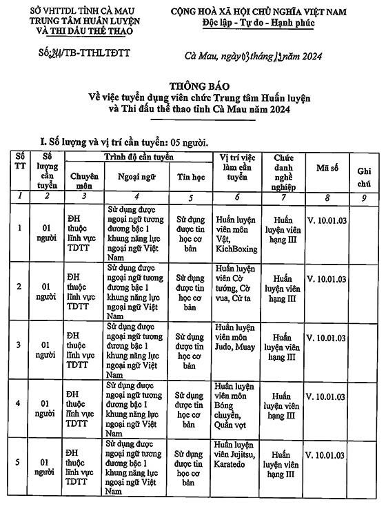 Trung tâm Huấn luyện và Thi đấu thể thao tỉnh Cà Mau tuyển dụng viên chức năm 2024, như sau: