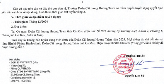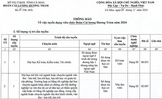 Thông báo tuyển dụng viên chức Đoàn Cải lương Hương Tràm 2024