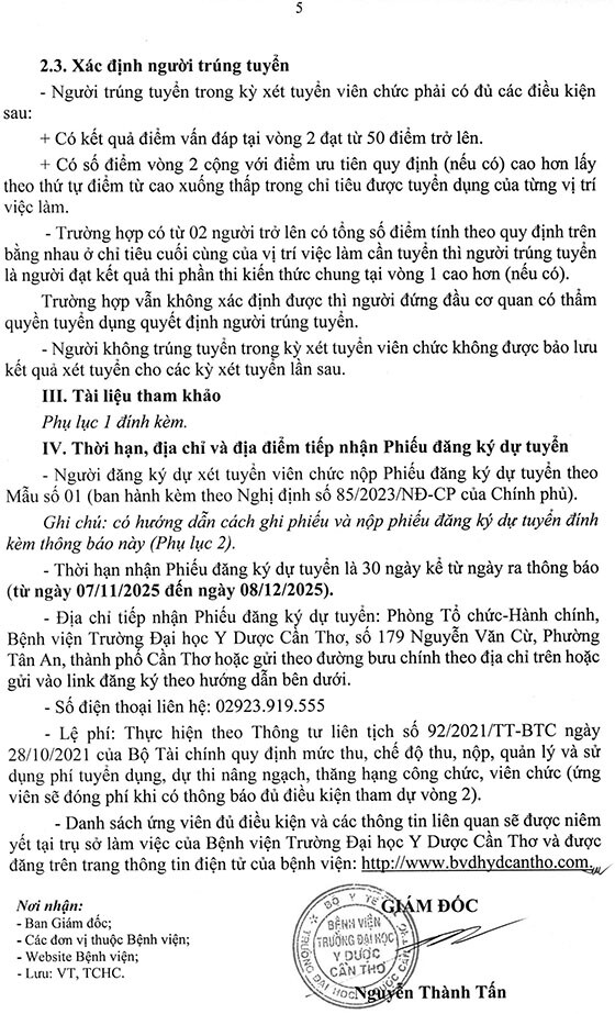 – Địa điểm: Phòng Tổ chức – Hành chính, Bệnh viện Trường Đại học Y Dược Cần Thơ, số 179 Nguyễn Văn Cừ, Phường An, thành phố Cần Thơ.