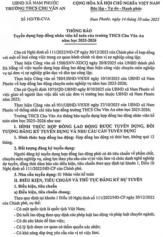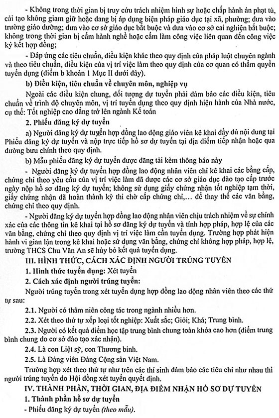 Trường THCS Chu Văn An thông báo tuyển dụng hợp đồng lao động nhân viên kế toán năm học 2025-2026 như sau: