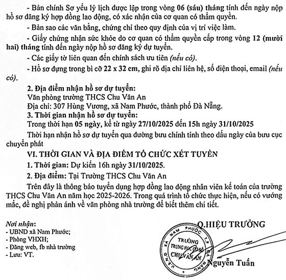 Trường THCS Chu Văn An, xã Nam Phước, Đà Nẵng tuyển dụng HĐLĐ nhân viên kế toán năm học 2025-2026