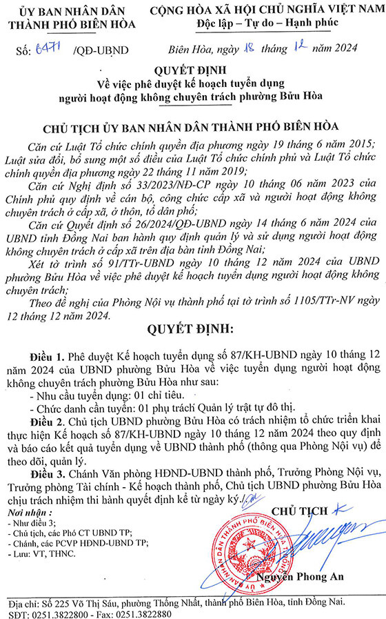 Thực hiện Quyết định số 6471/QĐ-UBND ngày 18/12/2024 của UBND thành phố Biên Hòa về việc phê duyệt kế hoạch tuyển dụng người hoạt động không chuyên trách phường Bửu Hòa.