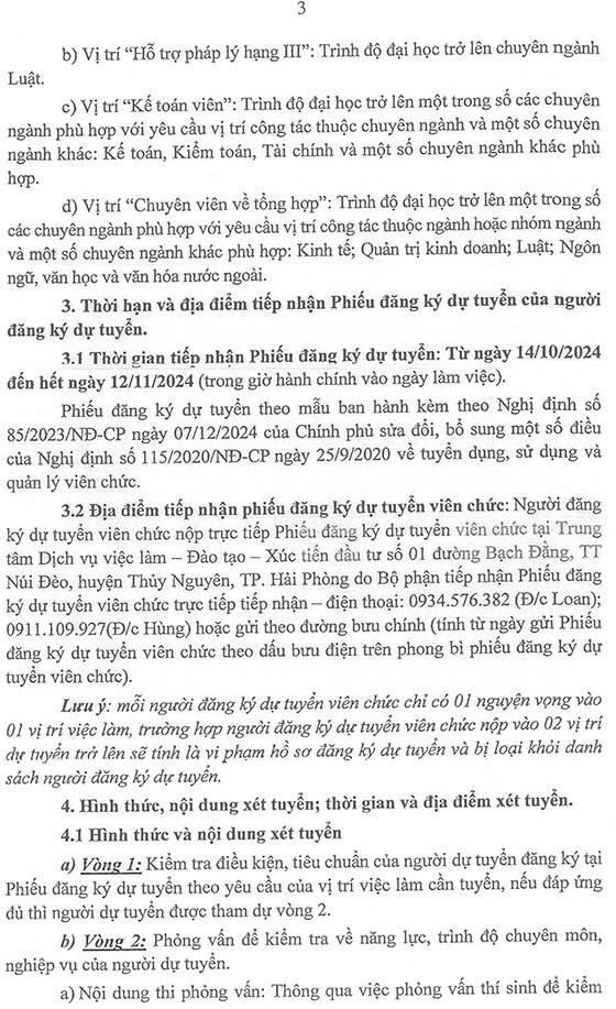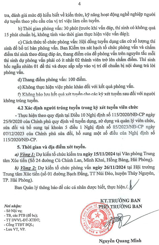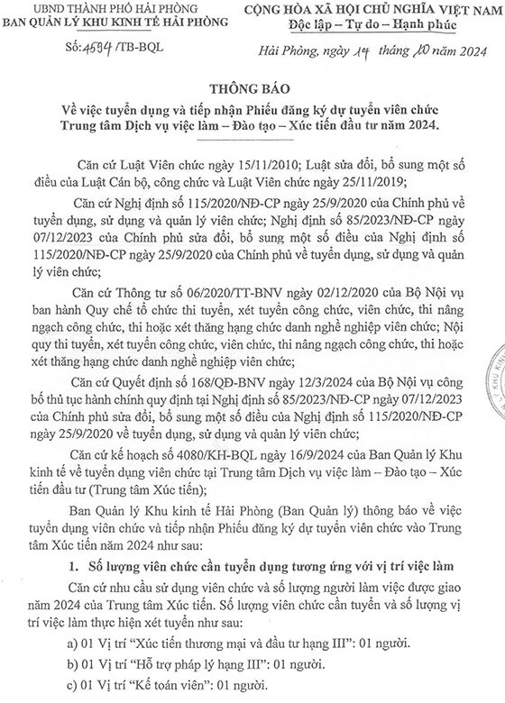 Ban Quản lý Khu kinh tế Hải Phòng (Ban Quản lý) thông báo về việc tuyển dụng viên chức và tiếp nhận Phiếu đăng ký dự tuyển viên chức vào Trung tâm Xúc tiến năm 2024 như sau: