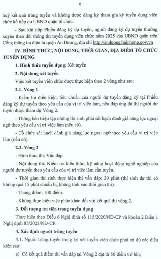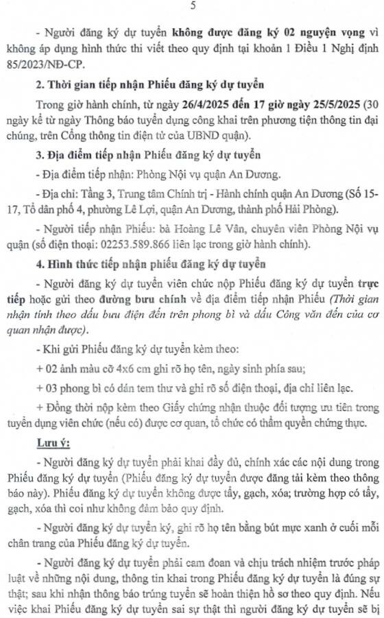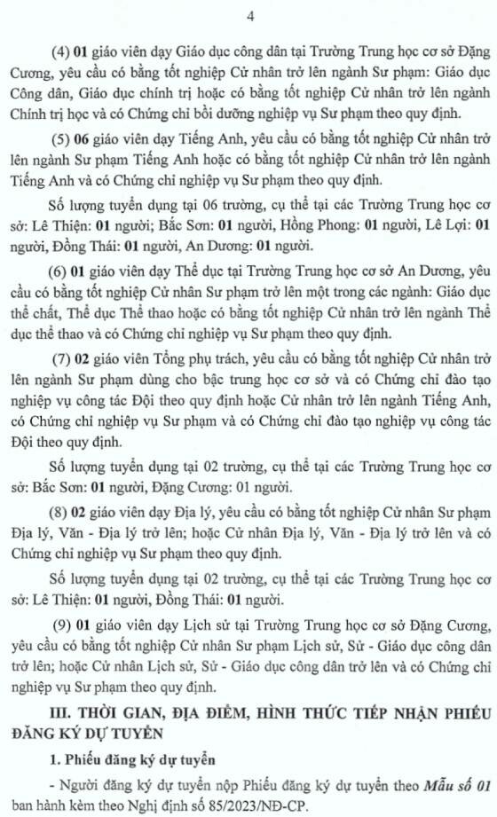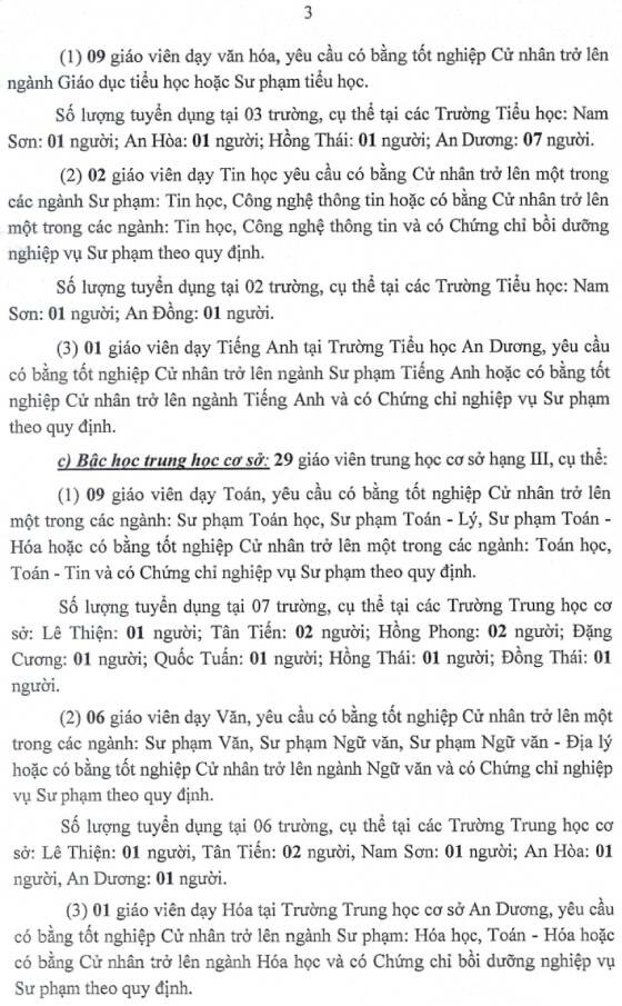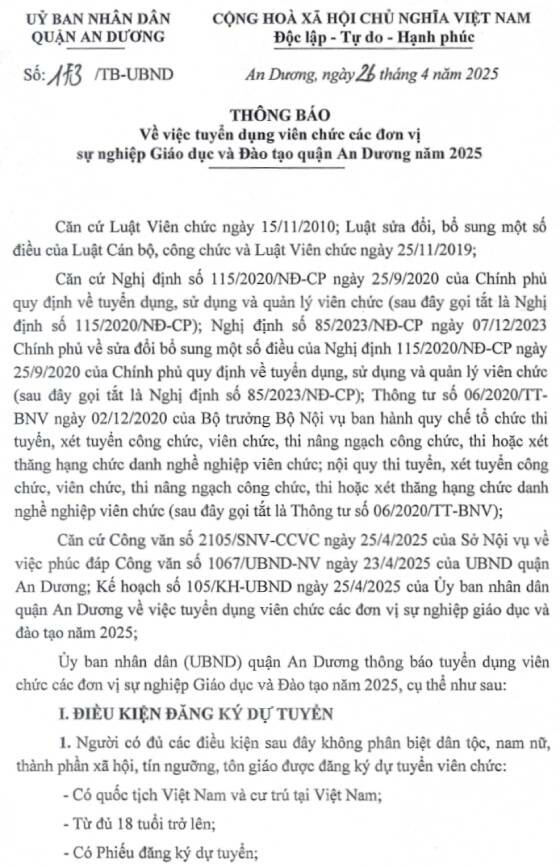 Ủy ban nhân dân (UBND) quận An Dương thông báo tuyển dụng viên chức các đơn vị sự nghiệp Giáo dục và Đào tạo năm 2025, cụ thể như sau: