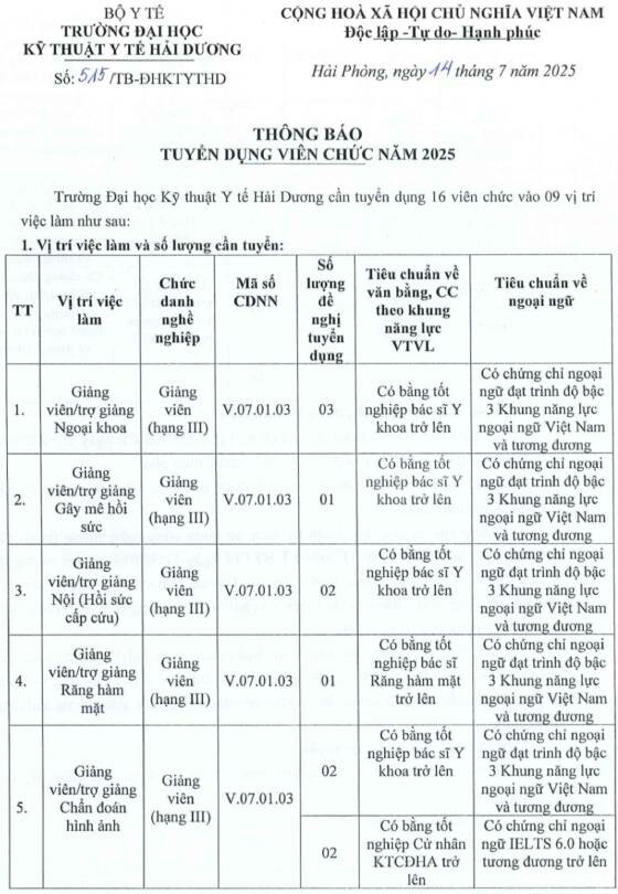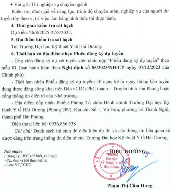 – Địa điểm: Phòng Tổ chức Hành chính Trường Đại học Kỹ thuật Y tế Hải Dương (Phòng 209), Địa chỉ: Số 1, Vũ Hựu, phường Lê Thanh Nghị, thành phố Hải Phòng.