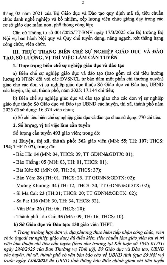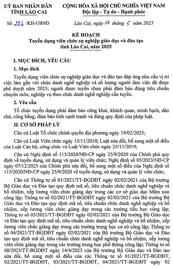 Căn cứ Kế hoạch số 226/KH-UBND ngày 16/05/2025 của UBND tỉnh Lào Cai về tuyển dụng viên chức sự nghiệp giáo dục và đào tạo tỉnh Lào Cai năm 2025, Sở Nội vụ thông báo nhu cầu tuyển dụng viên chức sự nghiệp giáo dục và đào tạo trong toàn tỉnh, cụ thể như sau: