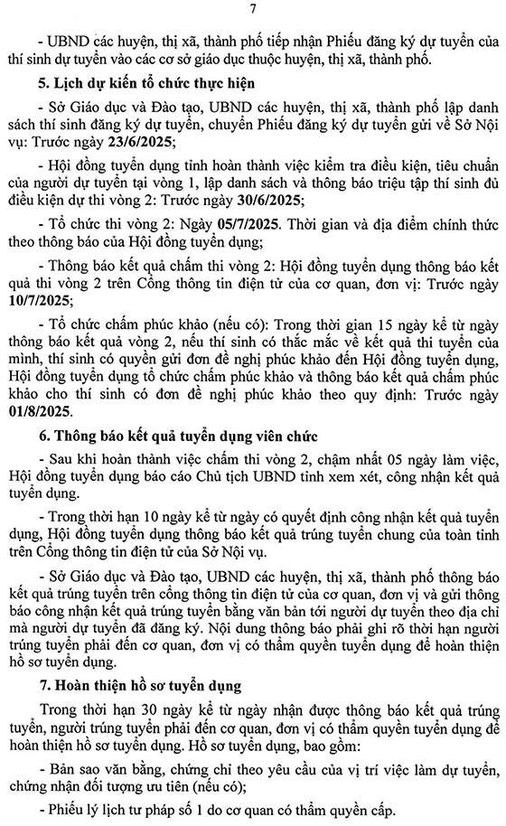 + Hội đồng tuyển dụng tỉnh hoàn thành việc kiểm tra điều kiện, tiêu chuẩn của người dự tuyển tại vòng 1, lập danh sách và thông báo triệu tập thí sinh đủ điều kiện dự thi vòng 2: Trước ngày 30/6/2025;