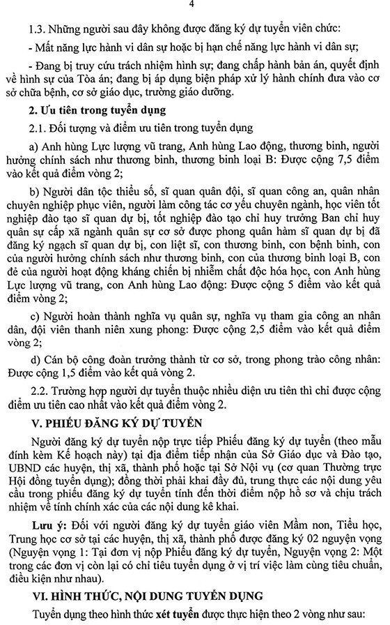 Lưu ý: Đối với người đăng ký dự tuyển giáo viên Mầm non, Tiểu học, Trung học cơ sở tại các huyện, thị xã, thành phố được đăng ký 02 nguyện vọng (Nguyện vọng 1: Tại huyện, thị xã, thành phố có chỉ tiêu tuyển dụng; Nguyện vọng 2: Một trong các đơn vị còn lại có chỉ tiêu tuyển dụng ở vị trí việc làm cùng tiêu chuẩn, điều kiện như nhau).