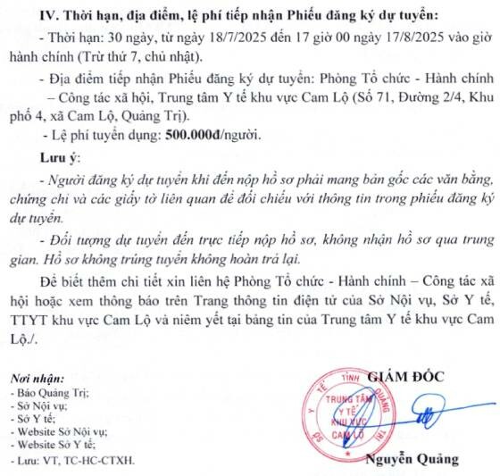 – Địa điểm: Phòng Tổ chức – Hành chính — Công tác xã hội, Trung tâm Y tế khu vực Cam Lộ (Số 71, Đường 2/4, Khu phố 4, xã Cam Lộ, Quảng Trị).