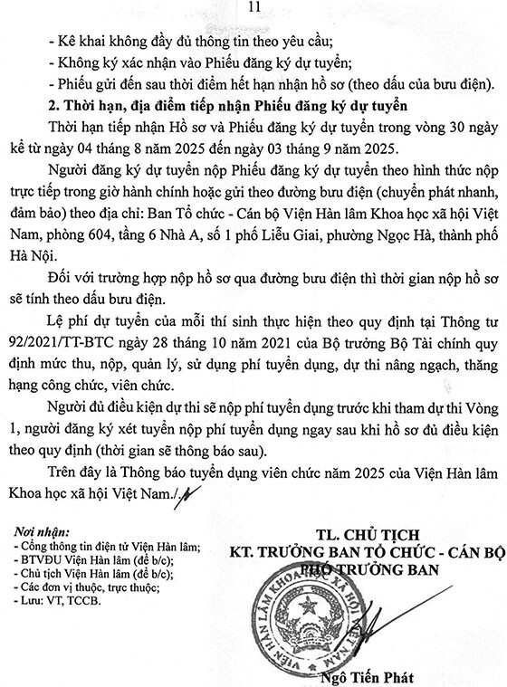 – Người đăng ký dự tuyển nộp Phiếu đăng ký dự tuyển theo hình thức nộp trực tiếp trong giờ hành chính hoặc gửi theo đường bưu điện theo địa chỉ: Ban Tổ chức – Cán bộ Viện Hàn lâm Khoa học xã hội Việt Nam, phòng 604, tầng 6, Nhà A, số 1 phố Liễu Giai, phường Ngọc Hà, thành phố Hà Nội