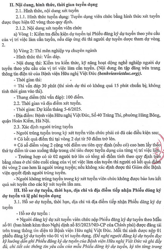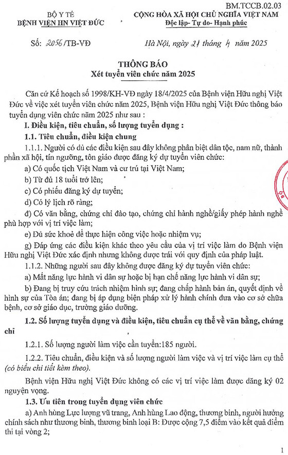 Căn cứ Kế hoạch số 1998/KH-VĐ ngày 18/4/2025 của Bệnh viện Hữu nghị Việt Đức về việc xét tuyển viên chức năm 2025, Bệnh viện Hữu nghị Việt Đức thông báo tuyển dụng viên chức năm 2025 như sau: