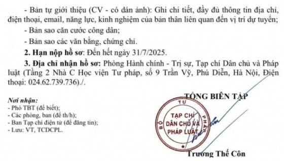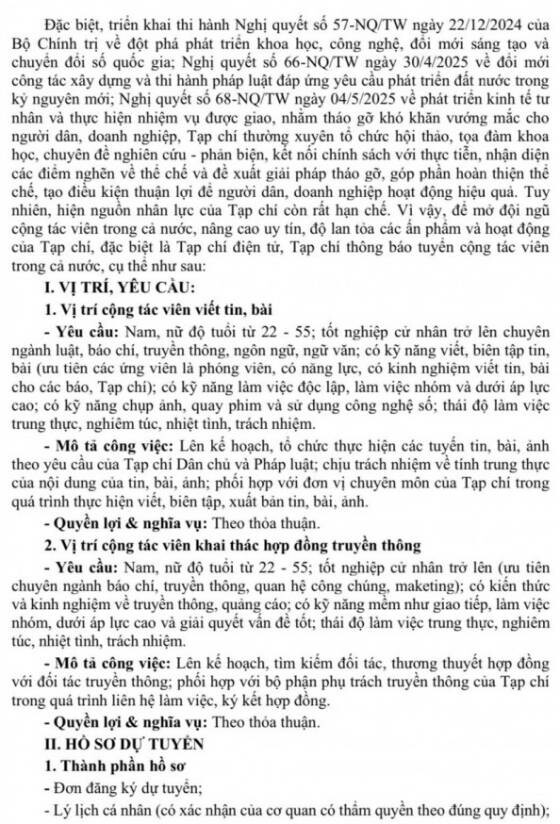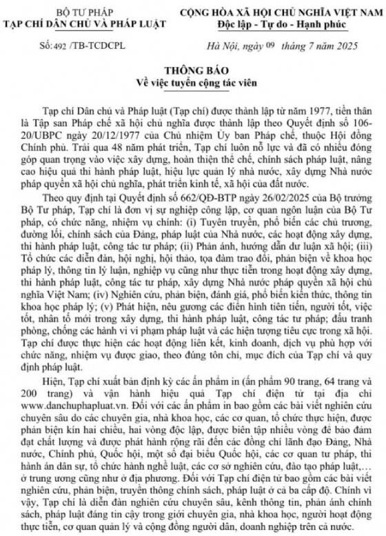 Tạp chí Dân chủ và Pháp luật thông báo tuyển cộng tác viên trong cả nước, cụ thể như sau: