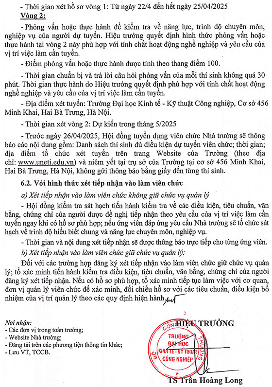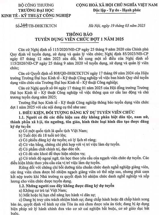 Trường Đại học Kinh tế – Kỹ thuật Công nghiệp thông báo tuyển dụng viên chức đợt 1 năm 2025 với các nội dung cụ thể như sau: