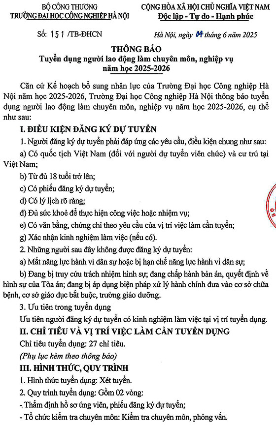 Căn cứ Kế hoạch bổ sung nhân lực của Trường Đại học Công nghiệp Hà Nội năm học 2025-2026, Trường Đại học Công nghiệp Hà Nội thông báo tuyển dụng người lao động làm chuyên môn, nghiệp vụ năm học 2025-2026, cụ thể như sau:
