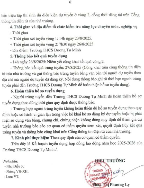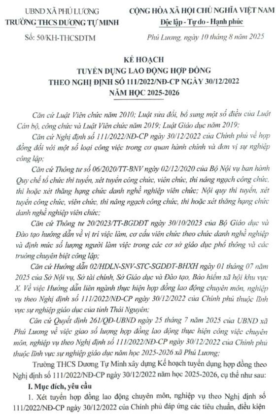 Căn cứ Kế hoạch số 32/KH/MNNL, ngày 20 tháng 8 năm 2025, của trường Mầm non Nhã Lộng về việc Tuyển hợp đồng viên chức lao động theo Nghị định số 111/2022/NĐ-CP ngày 30/12/2022 của Chính phủ;