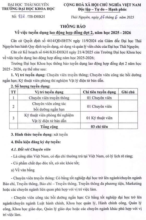 Trường Đại học Khoa học thông báo tuyển dụng lao động hợp đồng đợt 2 năm học 2025 – 2026, cụ thể như sau: