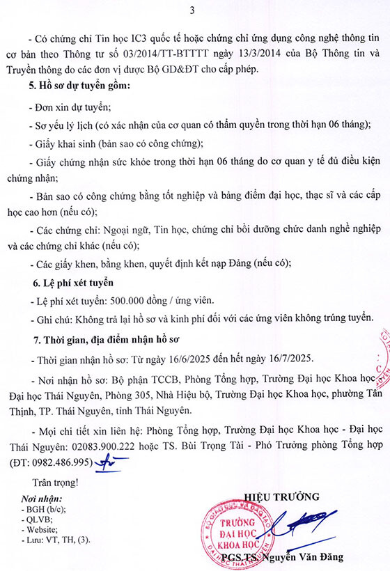 – Địa điểm: Bộ phận TCCB, Phòng Tổng hợp, Trường Đại học Khoa học – Đại học Thái Nguyên, Phòng 305, nhà Hiệu bộ, Trường Đại học Khoa học, phường Tân Thịnh, TP. Thái Nguyên, tỉnh Thái Nguyên.
