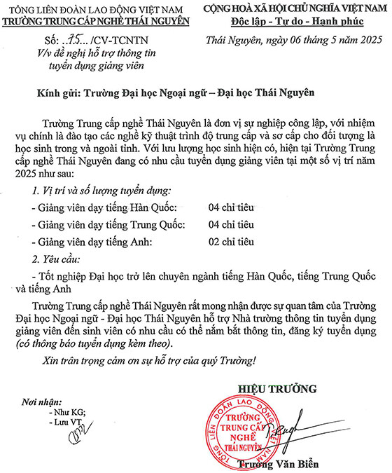 Với lưu lượng học sinh hiện có, hiện tại Trường Trung cấp nghề Thái Nguyê đang có nhu cầu tuyển dụng giảng viên tại một số vị trí năm 2025 như sau: